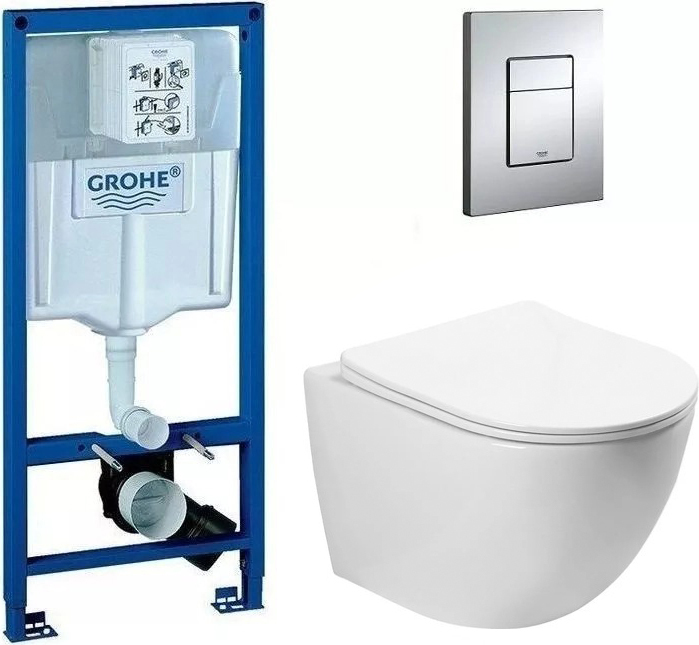 Комплект: инсталляция Grohe Rapid SL 3877200, кнопка смыва, безободковый унитаз SantiLine SL-5005, крепление.