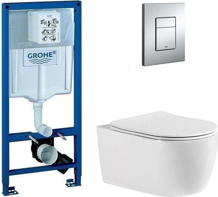 Комплект: инсталляция Grohe Rapid SL 38772001, кнопка смыва, подвесной унитаз Aquanet Smart W Rimless 276395, сиденье с крышкой микролифт, крепление.
