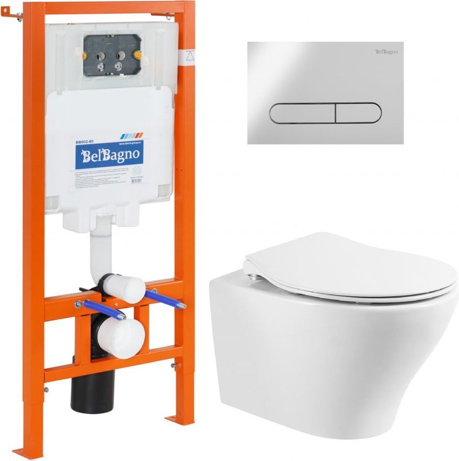 Инсталляция с подвесным безободковым унитазом BelBagno Acqua, сиденье с крышкой микролифт, кнопка смыва Prospero, хром.