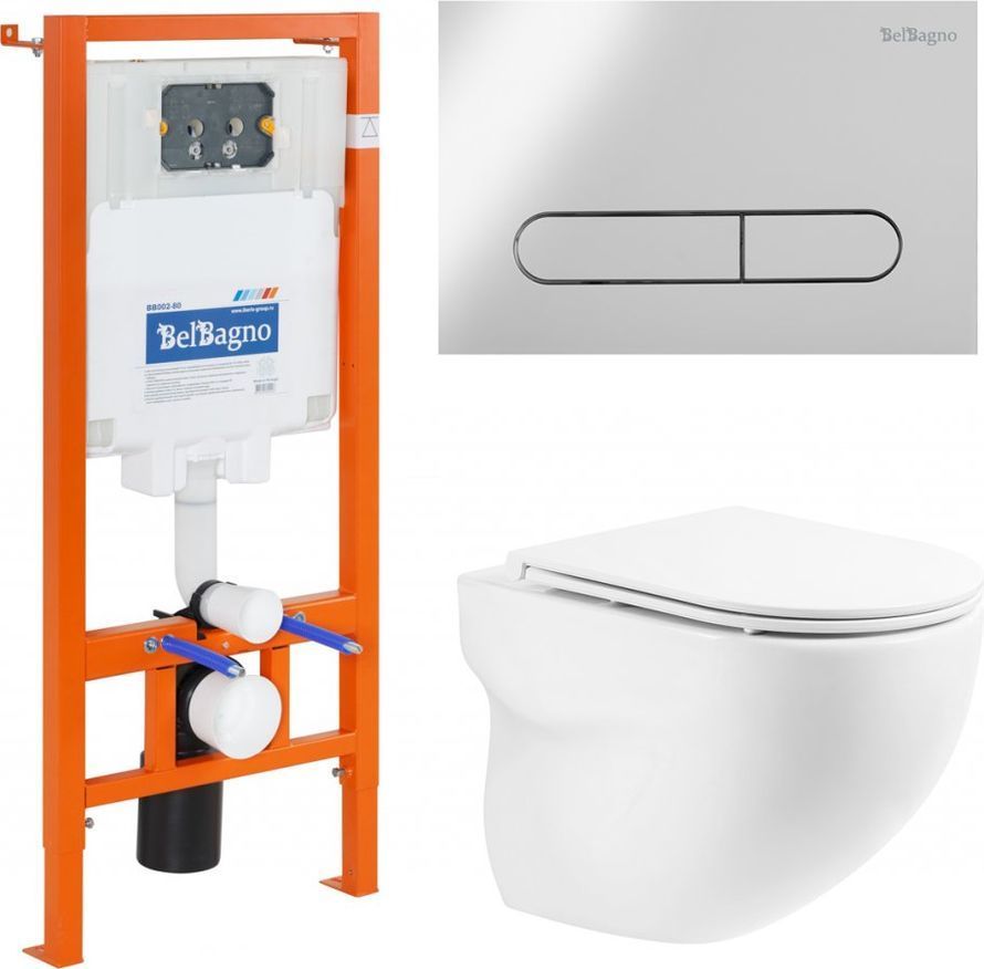 Инсталляция с подвесным безободковым унитазом BelBagno Onda, сиденье с крышкой микролифт, кнопка смыва Prospero, хром.