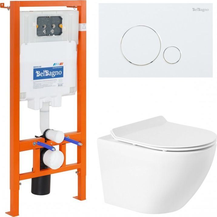 Инсталляция с подвесным безободковым унитазом BelBagno Sfera-R, сиденье с крышкой микролифт, кнопка смыва Sfera, белый.