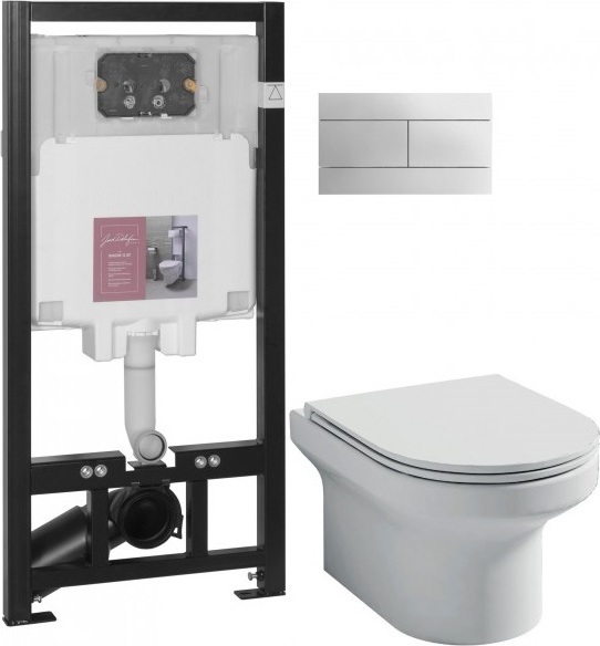 Инсталляция Jacob Delafon E29025 + подвесной безободковый унитаз Struktura EDE102 + сиденье с крышкой микролифт Struktura E20606 + кнопка смыва хром E4316.