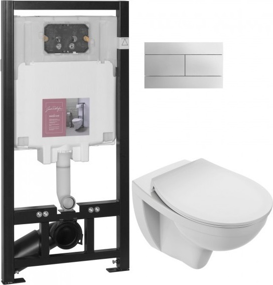 Инсталляция Jacob Delafon E29025-NF + подвесной унитаз Patio Rimless EDV102-00 + быстросъемное тонкое сиденье с крышкой микролифт Patio E23157-00 + кнопка смыва хром, глянец, пластик, механическая E4316-00.