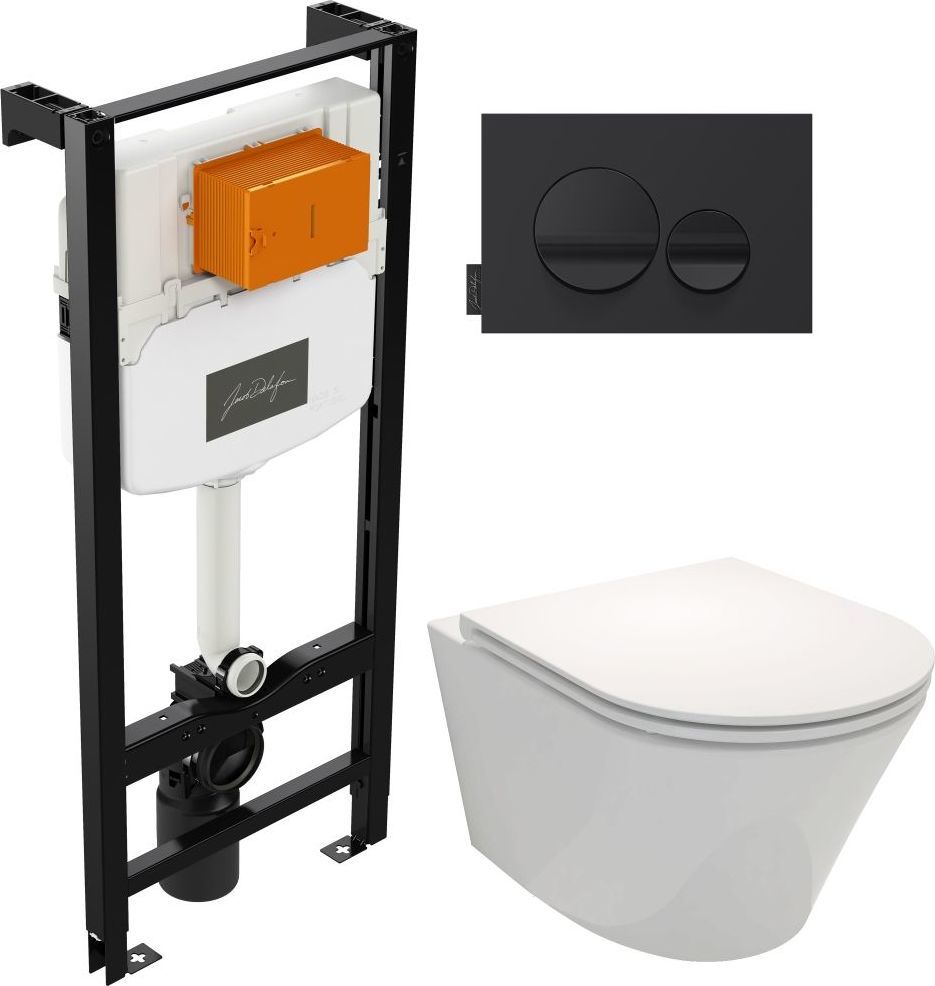Инсталляция Jacob Delafon + подвесной унитаз безободковый Rodin+ EDY102 + быстросъемное сиденье с крышкой микролифт Rodin+ E23280 + кнопка смыва E20859-7-BMT, черная.