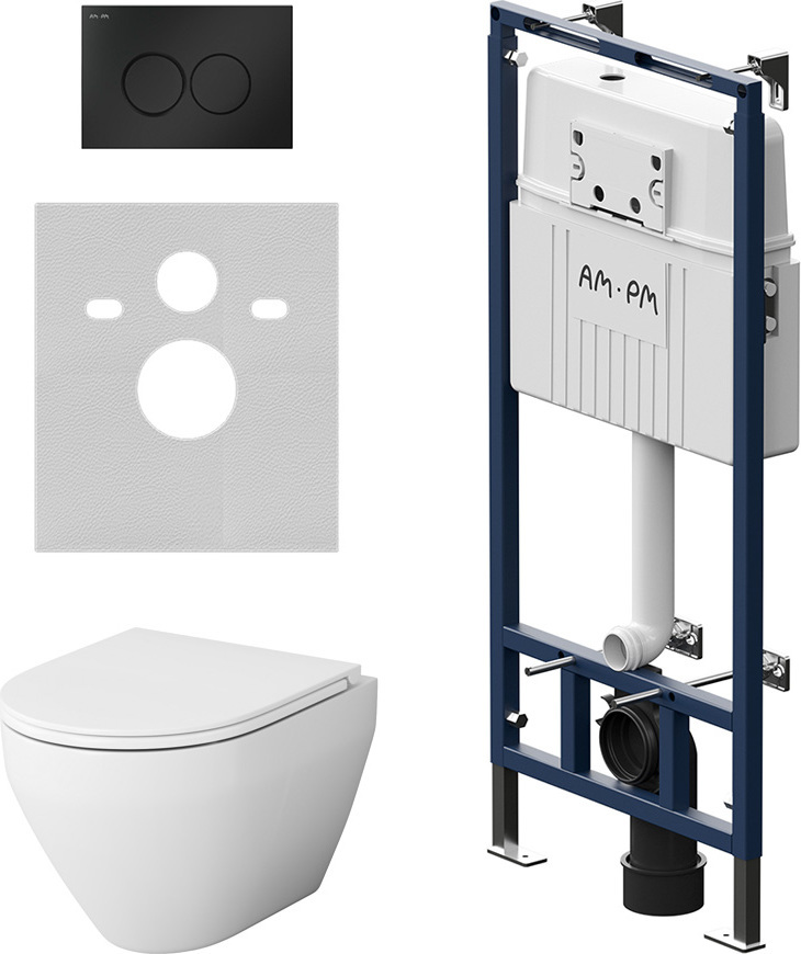 Инсталляция с подвесным унитазом Am.Pm Spirit V2.0 FlashClean IS100138.701700, шумоизоляционная прокладка, сиденье с крышкой микролифт, клавиша смыва - черная матовая.