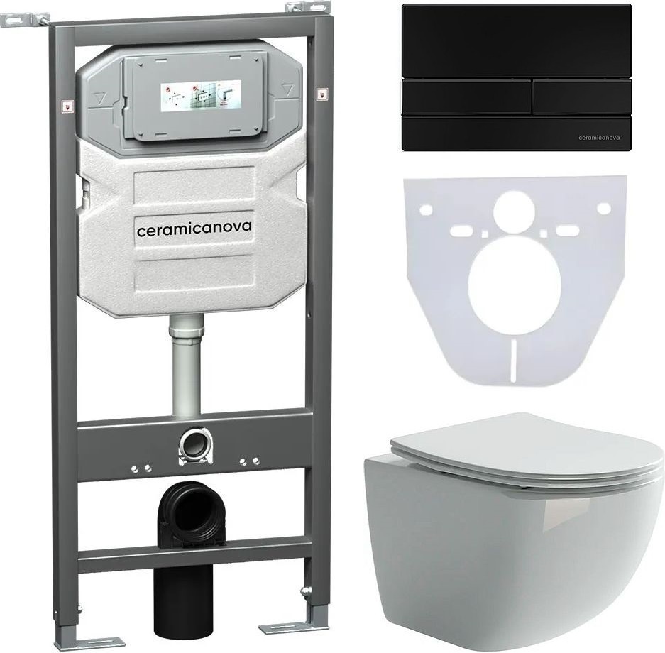 Сет 4 в 1: Подвесной унитаз Forma Rimless CN3009 + Шумоизоляционная панель для инсталляции CN1000 + Система инсталляции для унитазов Ceramicanova Envision с кнопкой смыва Flat цвет черный матовый и креплениями CN1002B.