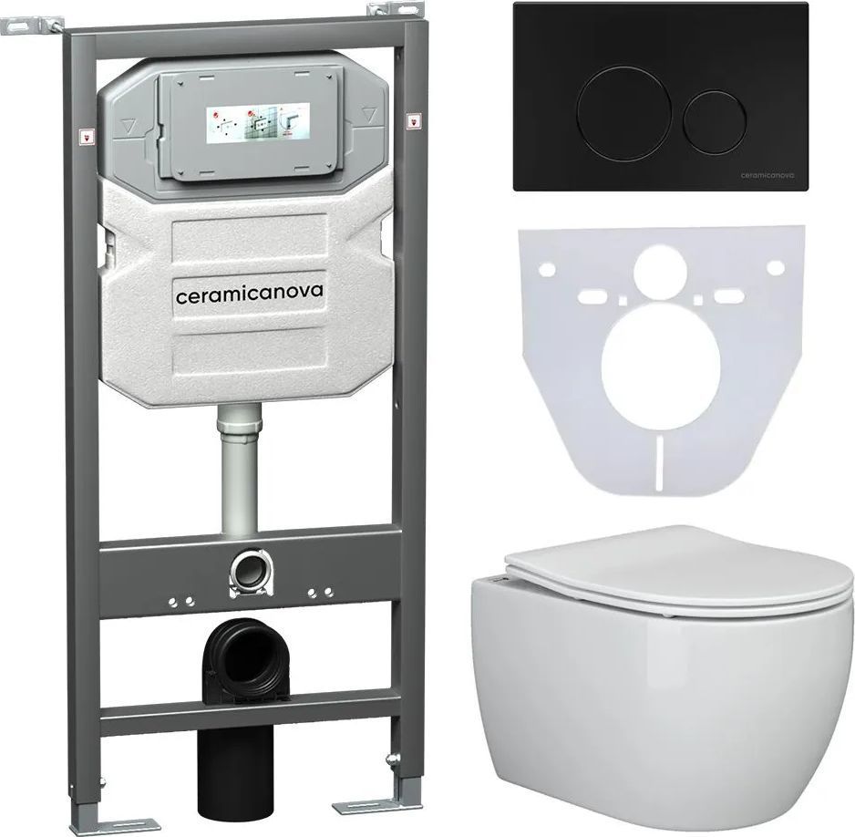 Сет 4 в 1: Подвесной унитаз Play Rimless CN3001 + Шумоизоляционная панель для инсталляции CN1000 + Система инсталляции для унитазов Ceramicanova Envision с кнопкой смыва Round цвет чёрный матовый и креплениями CN1001B.