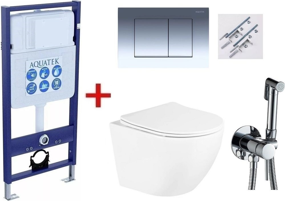 Инсталляция с подвесным унитазом комплект: Aquatek Standart 50 INS-0000012 с подвесным безободковым унитазом BelBagno Uno BB3105CHR/SC сиденье микролифт, крепление, кнопка смыва хром глянцевая + набор для гигиенического душа Haiba HB5511