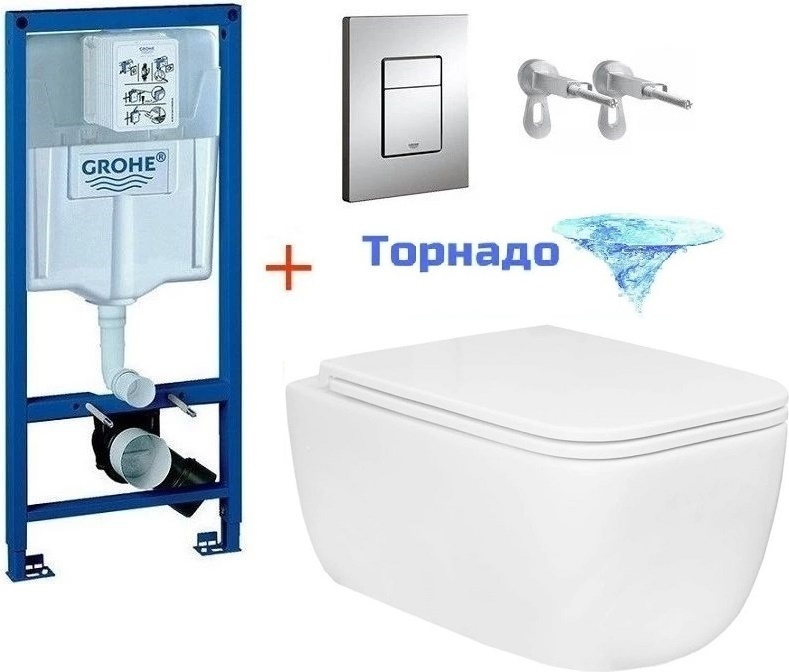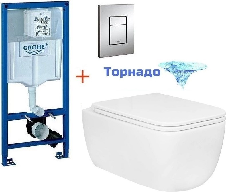 Инсталляция с подвесным унитазом комплект: Grohe Rapid SL 38772001 с подвесным безободковым унитазом Azario Flavia AZ-0076-UQ1 сиденье микролифт, крепление, кнопка смыва хром (Система смыва торнадо)