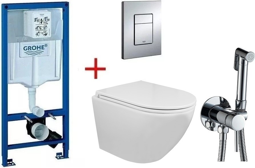 Инсталляция с подвесным унитазом комплект: Grohe Rapid SL 38772001 с подвесным безободковым унитазом Azario Grado AZ-0046 сиденье микролифт, крепление, кнопка смыва хром + набор для гигиенического душа Haiba HB5511