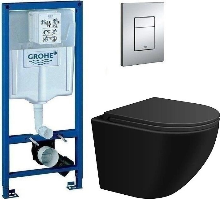 Инсталляция с подвесным унитазом комплект: Grohe Rapid SL 38772001 с подвесным безободковым унитазом Sintesi Evi SIN-TS-EVI-151BM сиденье микролифт, крепление, кнопка смыва хром