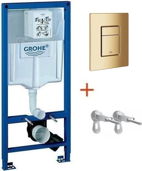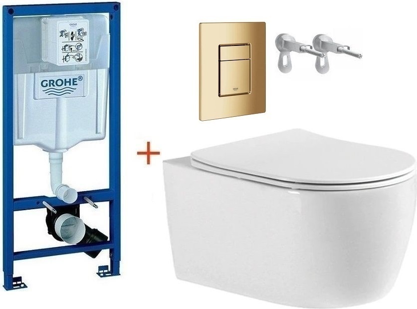 Инсталляция с подвесным унитазом комплект: Grohe Rapid SL 38772001+38732GL0 с подвесным безободковым унитазом Aquatek Европа AQ1106-00 сиденье микролифт, крепление, кнопка смыва золото глянцевое