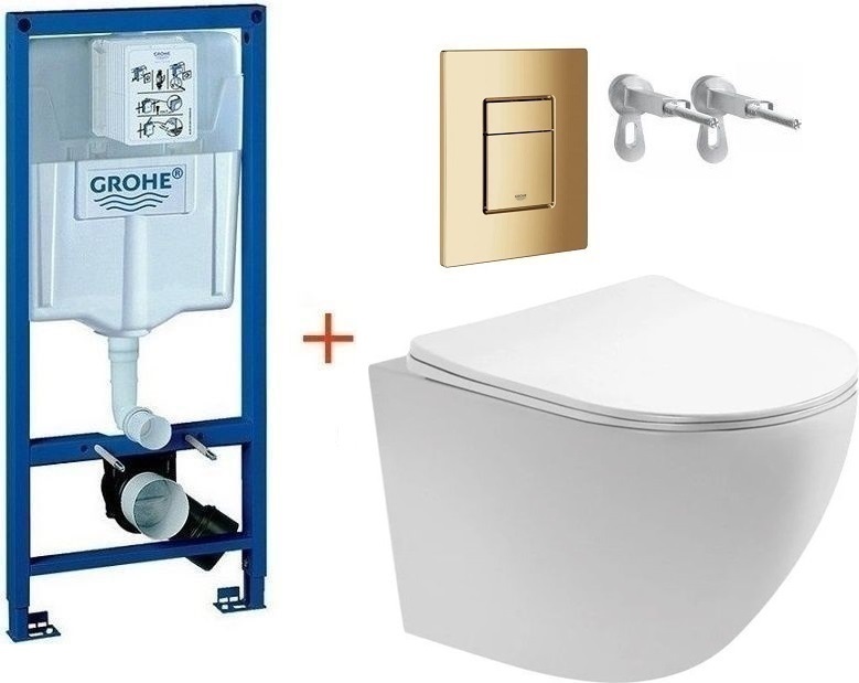 Инсталляция с подвесным унитазом комплект: Grohe Rapid SL 38772001+38732GL0 с подвесным безободковым унитазом Aquatek Европа AQ1900-00 сиденье микролифт, крепление, кнопка смыва золото глянцевое