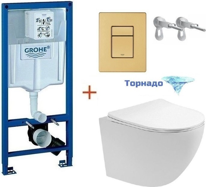 Инсталляция с подвесным унитазом комплект: Grohe Rapid SL 38772001+38732GN0 с подвесным безободковым унитазом Aquatek Европа AQ1900T-00 сиденье микролифт, крепление, кнопка смыва золото матовое (Система смыва торнадо)