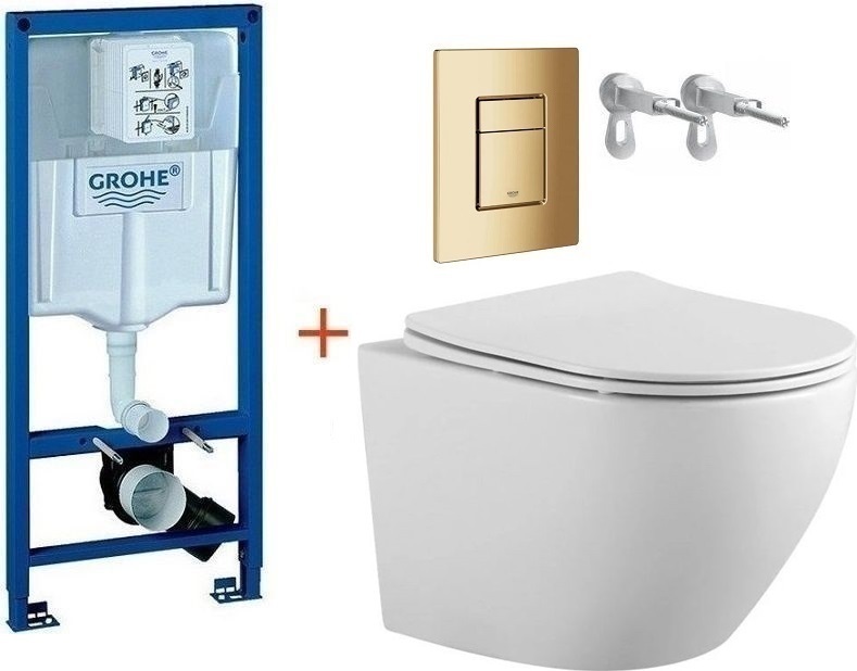 Инсталляция с подвесным унитазом комплект: Grohe Rapid SL 38772001+38732GL0 с подвесным безободковым унитазом Aquatek Европа AQ1901-00 сиденье микролифт, крепление, кнопка смыва золото глянцевое