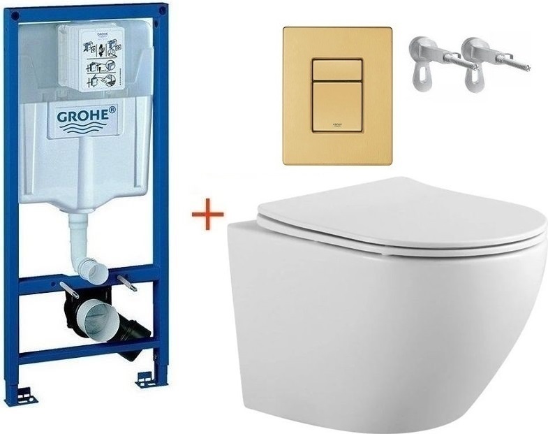 Инсталляция с подвесным унитазом комплект: Grohe Rapid SL 38772001+38732GN0 с подвесным безободковым унитазом Aquatek Европа AQ1901-00 сиденье микролифт, крепление, кнопка смыва золото матовое