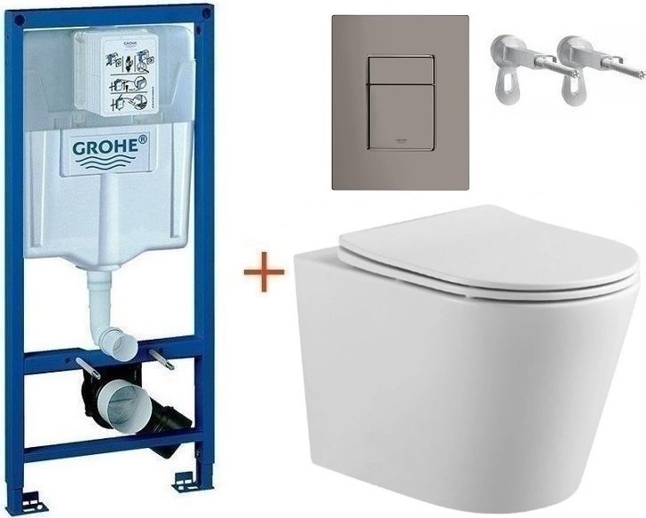 Инсталляция с подвесным унитазом комплект: Grohe Rapid SL 38772001+38732A00 с подвесным безободковым унитазом Aquatek Вега AQ1904-00 сиденье микролифт, крепление, кнопка смыва графит глянцевый