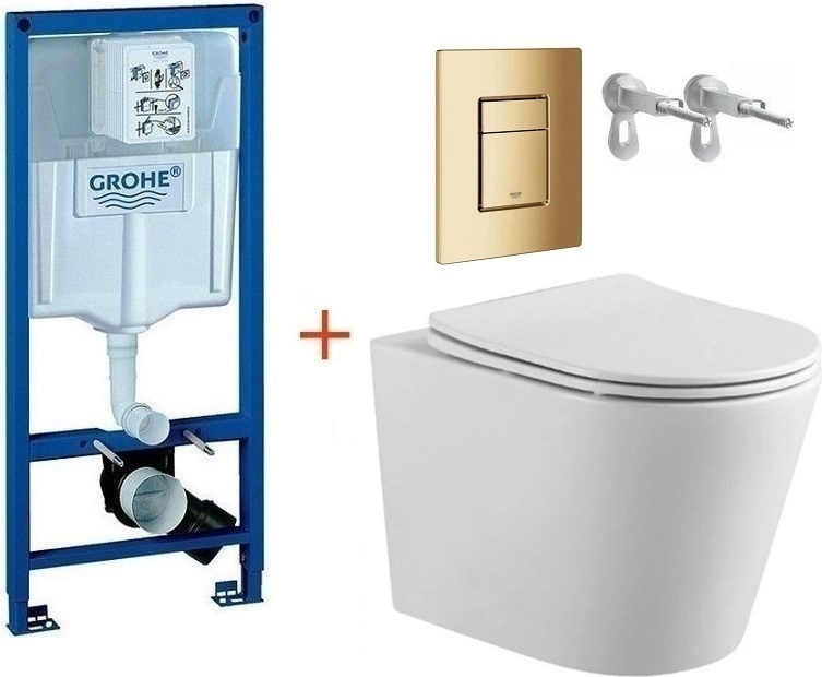 Инсталляция с подвесным унитазом комплект: Grohe Rapid SL 38772001+38732GL0 с подвесным безободковым унитазом Aquatek Вега AQ1904-00 сиденье микролифт, крепление, кнопка смыва золото глянцевое