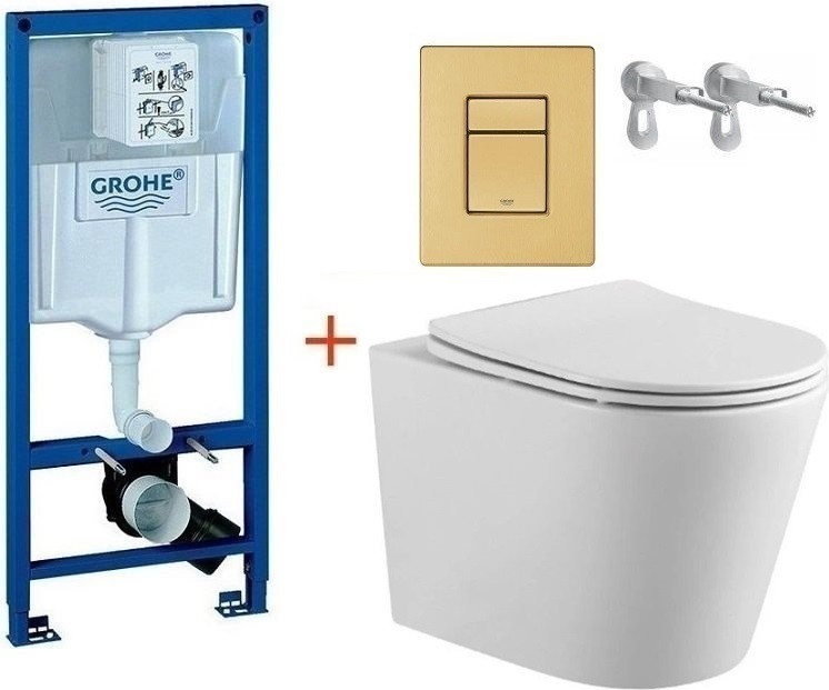 Инсталляция с подвесным унитазом комплект: Grohe Rapid SL 38772001+38732GN0 с подвесным безободковым унитазом Aquatek Вега AQ1904-00 сиденье микролифт, крепление, кнопка смыва золото матовое