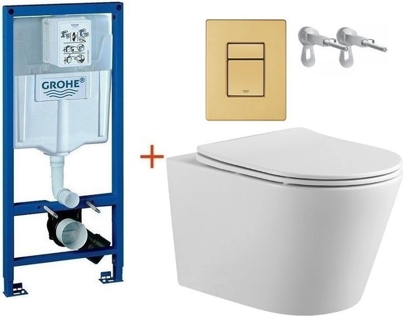 Инсталляция с подвесным унитазом комплект: Grohe Rapid SL 38772001+38732GN0 с подвесным безободковым унитазом Aquatek Вега AQ1905-00 сиденье микролифт, крепление, кнопка смыва золото матовое