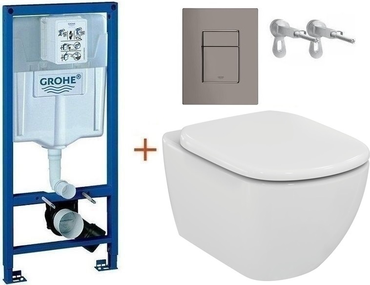 Инсталляция с подвесным унитазом комплект: Grohe Rapid SL 38772001+38732A00 с подвесным безободковым унитазом Ideal Standard Tesi AquaBlade T007901 сиденье микролифт, крепление, кнопка смыва графит глянцевый