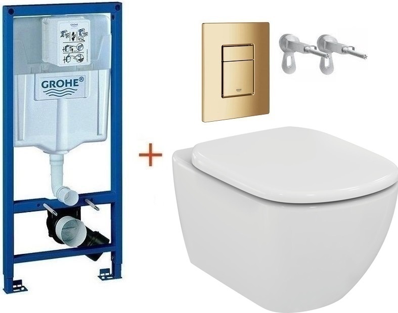 Инсталляция с подвесным унитазом комплект: Grohe Rapid SL 38772001+38732GL0 с подвесным безободковым унитазом Ideal Standard Tesi AquaBlade T007901 сиденье микролифт, крепление, кнопка смыва золото глянцевое