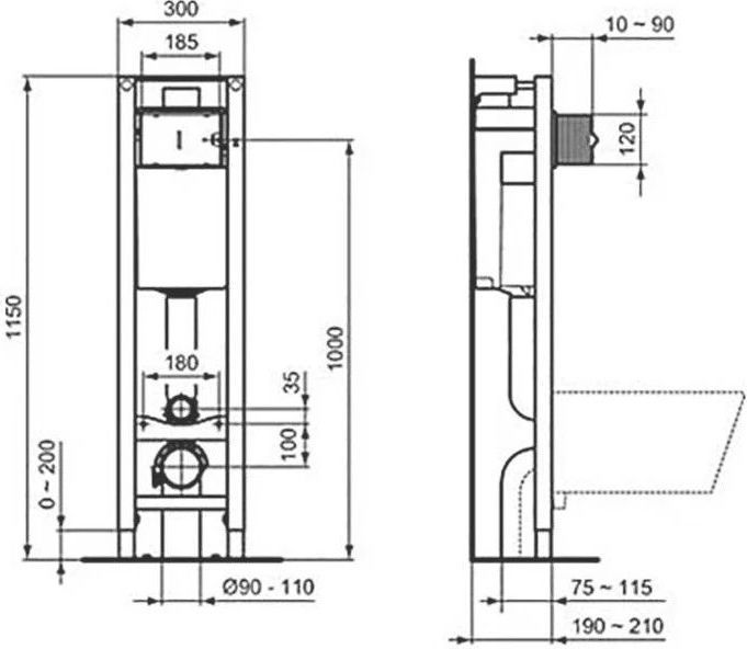 - Аксессуары в комплекте: крепеж для унитаза; крепежи для рамы; подсоединения входящей и сливной труб; сливная труба и адаптер ⌀ 90/110; резиновая прокладка для унитаза ⌀ 45 мм; защитная коробка; запорный клапан G 1/2 "