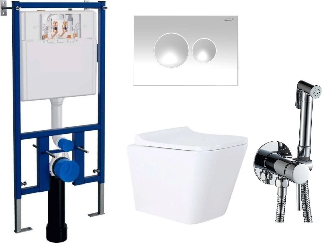 Инсталляция с подвесным унитазом комплект: Loranto 4501 с подвесным безободковым унитазом Teramo AZ-0052 сиденье микролифт, кнопка смыва белая глянцевая + набор для гигиенического душа Haiba HB5511.
