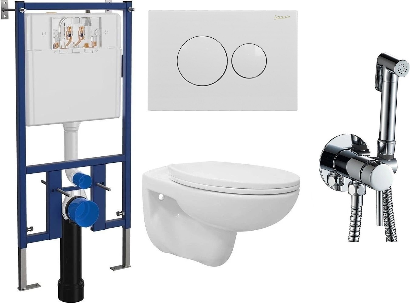 Инсталляция с подвесным унитазом комплект: Loranto Fredo 4501 с подвесным безободковым унитазом Fredo CS-WH8005 сиденье микролифт, кнопка смыва белая глянцевая + набор для гигиенического душа Haiba HB5511.