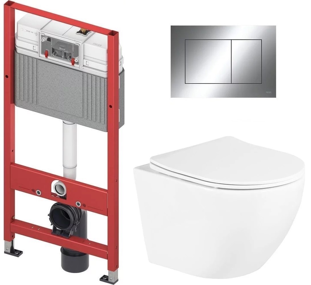 Инсталляция с подвесным унитазом комплект: TECEbase 2.0 9400412 с подвесным безободковым унитазом BelBagno Uno BB3105CHR/SC сиденье микролифт, крепление, кнопка смыва хром глянцевый.