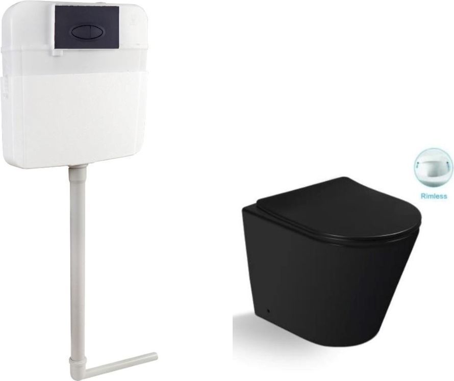 Скрытый бачок с приставным безободковым унитазом SantiLine SL-5020+SL05 + сиденье с крышкой микролифт + кнопка смыва черный матовый.