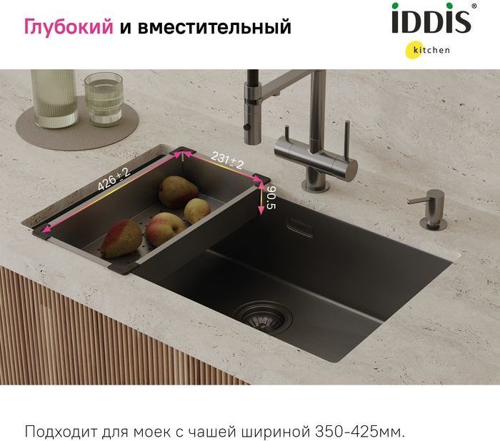 - Идеально подходит для моек IDDIS® с шириной чаши 350-425 мм, глубиной от 110 мм и длиной от 240 мм.