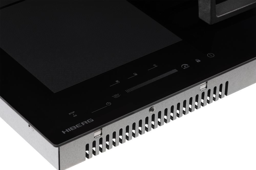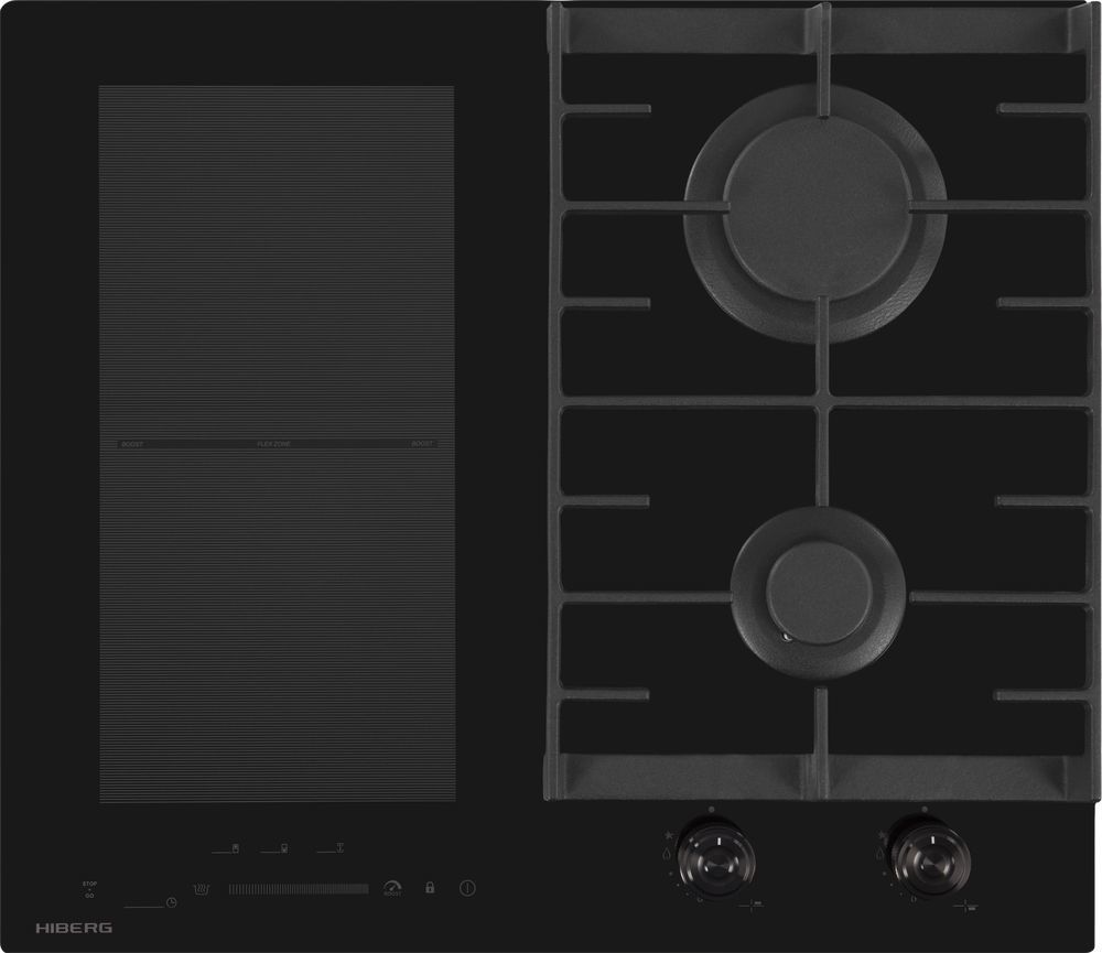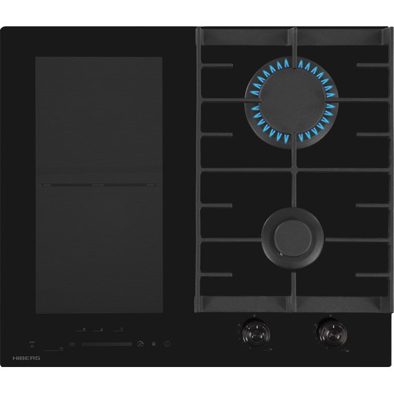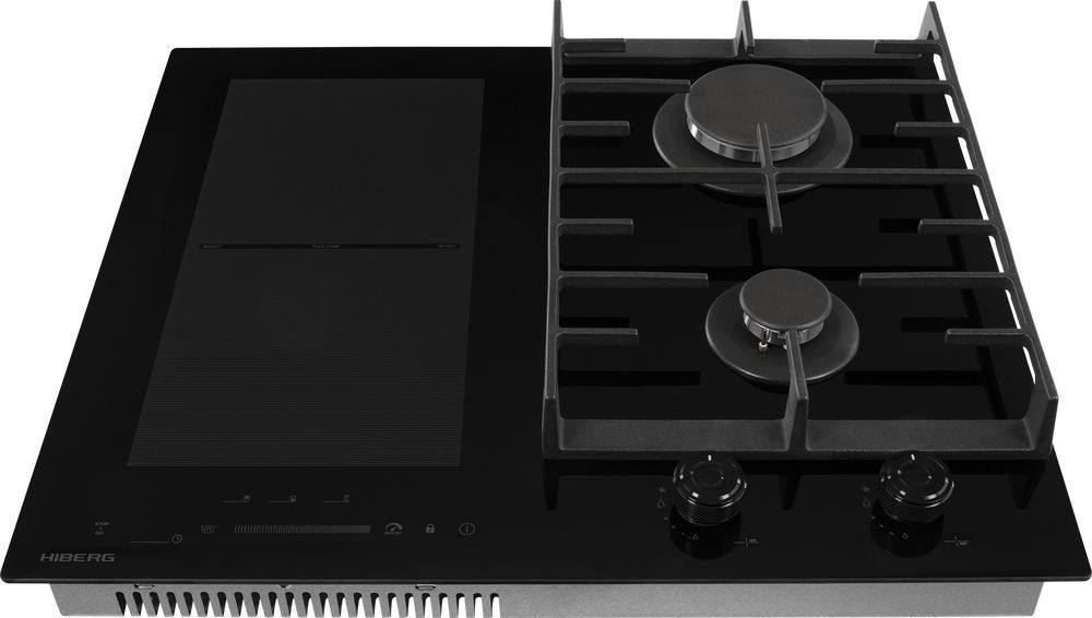 - Комбинированная варочная поверхность HIBERG i-VM 6021 B выполнена из стеклокерамики черного цвета и оснащена 2 газовыми конфорками и 2 индукционными с возможностью объединения зон.