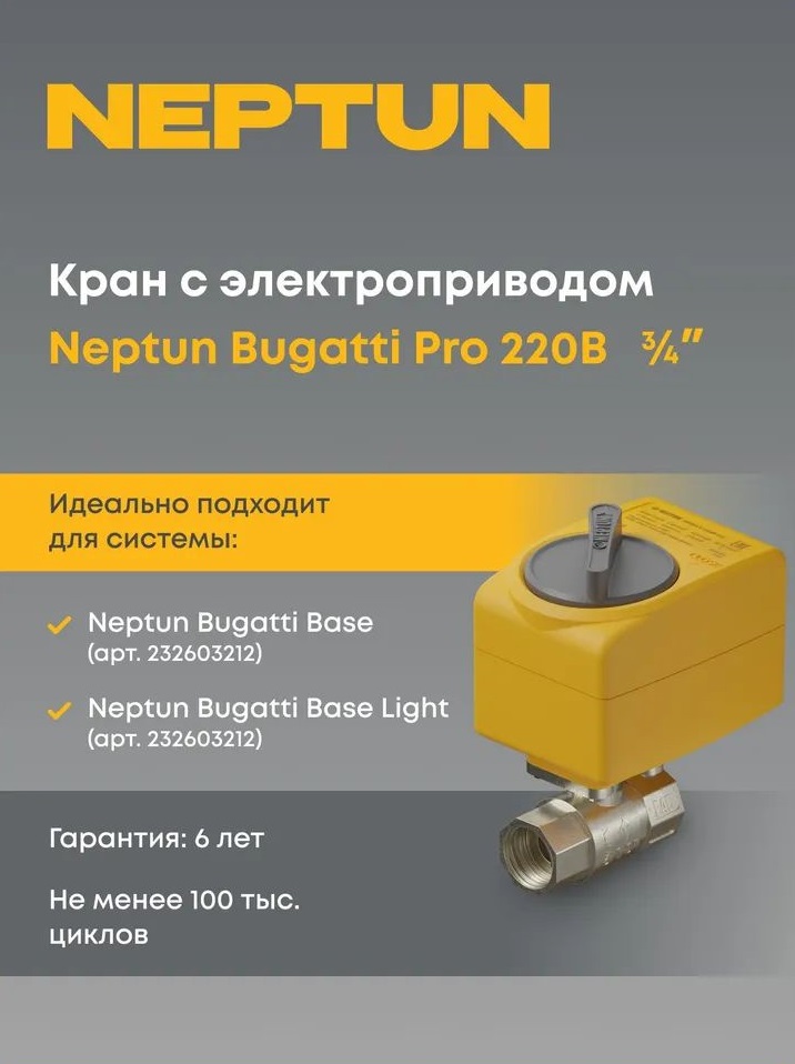 - Кран с электроприводом Neptun Bugatti Pro 220B 3/4 используется в системах контроля протечки воды, в системах обогрева, фанкойлах, тепловых насосах и так далее.