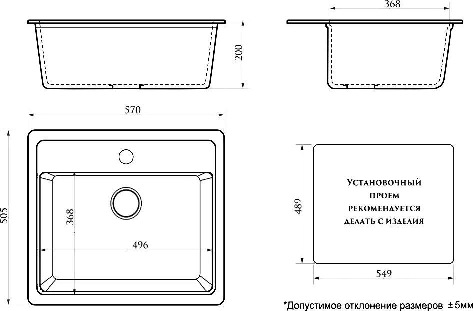 Врезная установка - способ установки, при котором в столешнице вырезается отверстие под размер мойки. Данный параметр подразумевает, что мойки будут устанавливаться поверх столешницы. Как правило размер отверстия под мойку на 2 см (20 мм) меньше внешнего размера мойки. Пример: Внешний размер мойки - 800х500 мм. Размер отверстия под данную мойку 780х480 мм.