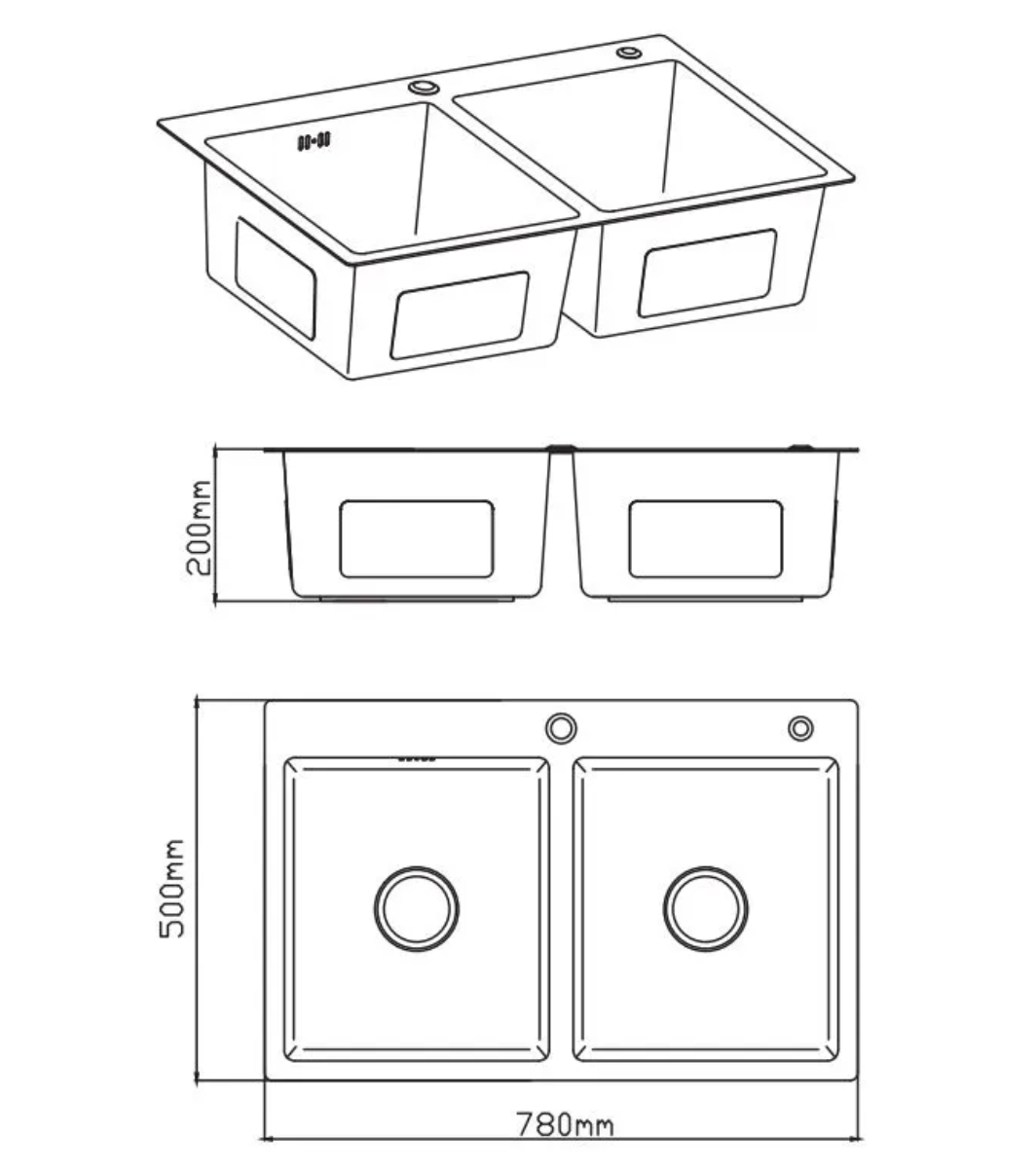 Пример: Внешний размер мойки - 800х500 мм. Размер отверстия под данную мойку 780х480 мм.