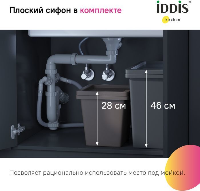 - В комплекте: крепеж, выпуск, плоский сифон (занимает меньше места, освобождая полезное пространство).