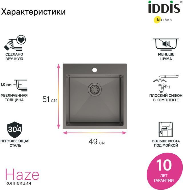 Кухонная мойка Iddis Haze HAZ49GMi77, материал нержавеющая сталь, цвет графит матовый.