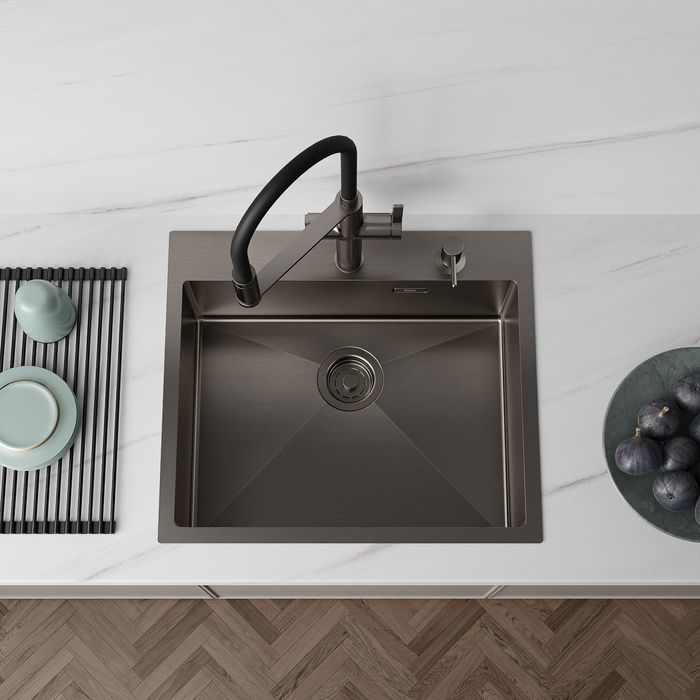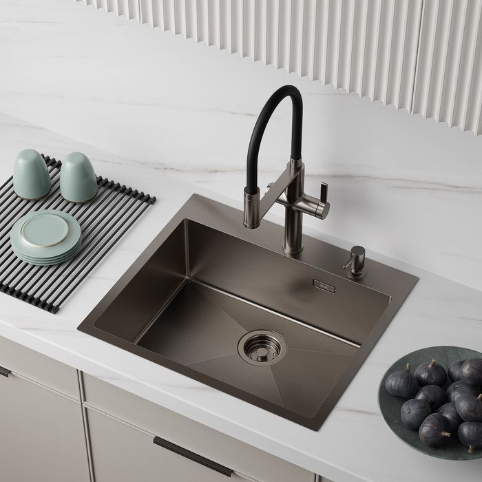 - Красивый и стойкий графитовый цвет достигается путем обработки мойки парообразным металлом: частички краски проникают в структуру стали и образуют микрослой (PVD-покрытие) на поверхности.