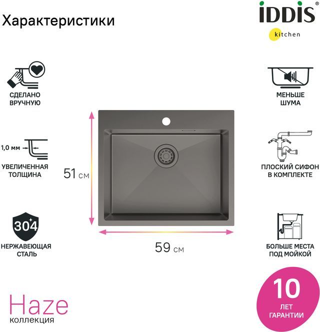 Кухонная мойка Iddis Haze HAZ59GMi77, материал нержавеющая сталь, цвет графит матовый.