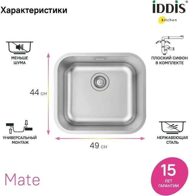 Кухонная мойка Iddis Mate MAT49S0i77, материал нержавеющая сталь. Цвет сатин.