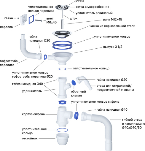 Есть все для монтажа: выпуск, сифон, уплотнительная лента, крепеж.