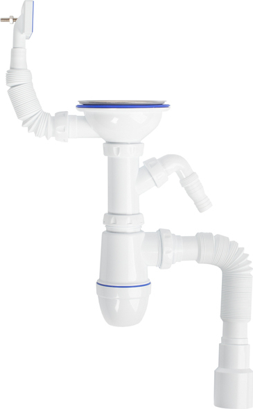 Выпуск из качественного полипропилена выдержит воздействие воды и бытовой химии; сетчатая корзинка из нержавеющей стали, хромированный шток, винт и ручка из латуни.