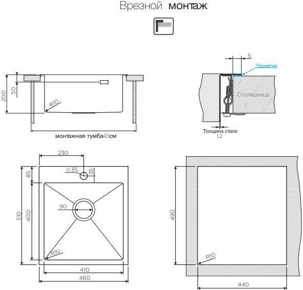 Врезная установка - способ установки, при котором в столешнице вырезается отверстие под размер мойки.