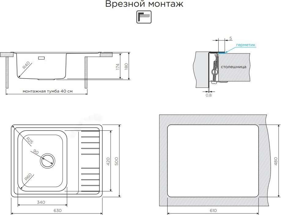 Пример: Внешний размер мойки - 800х500 мм. Размер отверстия под данную мойку 780х480 мм.