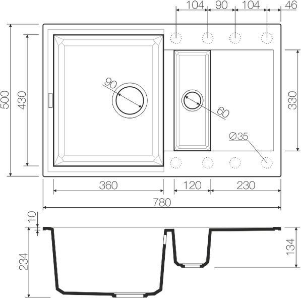 Врезная установка - способ установки, при котором в столешнице вырезается отверстие под размер мойки. Данный параметр подразумевает, что мойки будут устанавливаться поверх столешницы. Как правило размер отверстия под мойку на 2 см (20 мм) меньше внешнего размера мойки. Пример: Внешний размер мойки - 800х500 мм. Размер отверстия под данную мойку 780х480 мм.