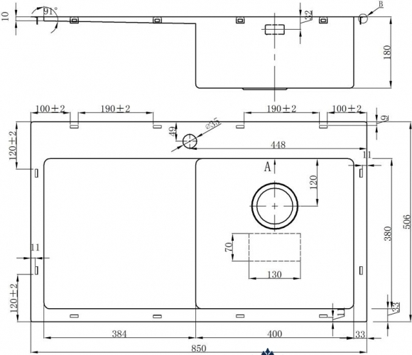 Пример: Внешний размер мойки - 800х500 мм. Размер отверстия под данную мойку 780х480 мм.