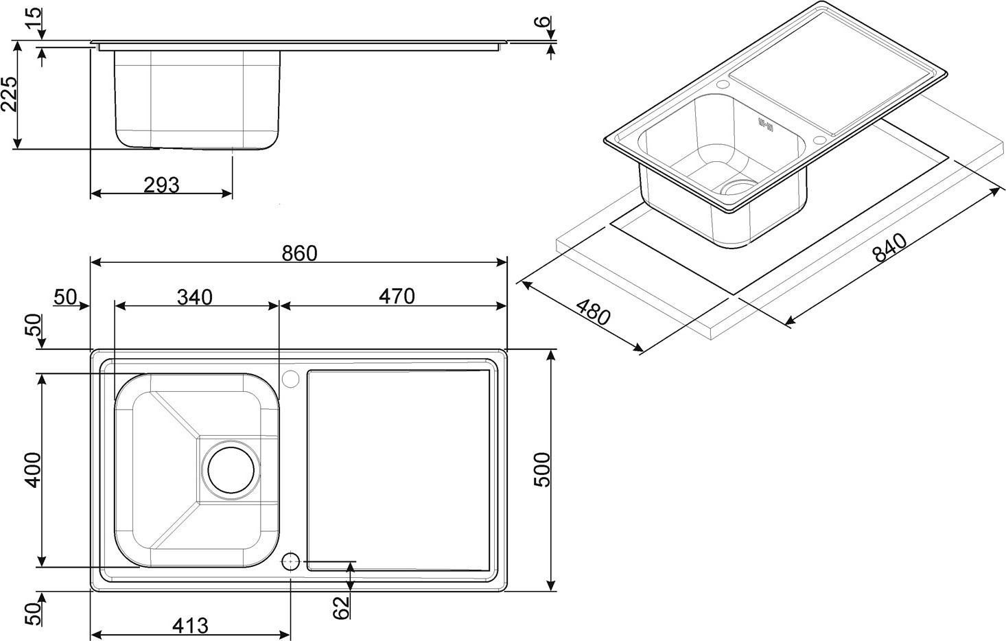 Пример: Внешний размер мойки - 800х500 мм. Размер отверстия под данную мойку 780х480 мм.