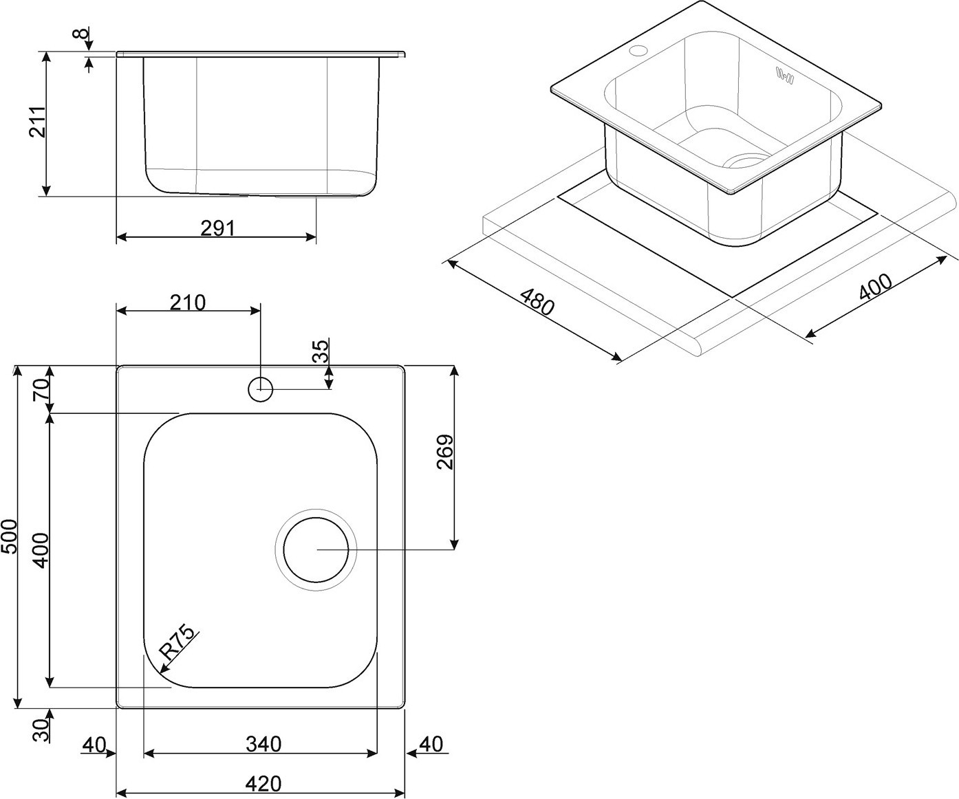Пример: Внешний размер мойки - 800х500 мм. Размер отверстия под данную мойку 780х480 мм.