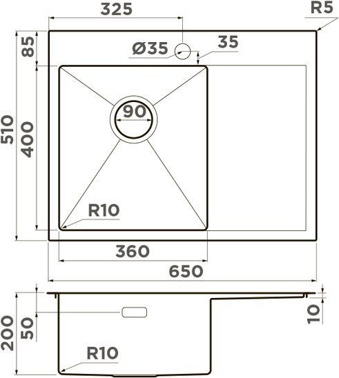 Пример: Внешний размер мойки - 800х500 мм. Размер отверстия под данную мойку 780х480 мм.